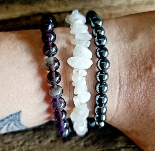 INTUITION AND PROTECTION BRACELET STACK - AMETHYST, HEMATITE AND MOONSTONE