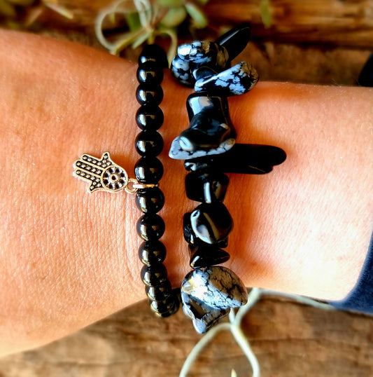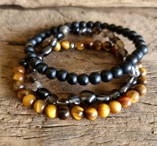 TRIPLE PROTECTION BRACELET STACK - TIGERS EYE, SMOKY QUARTZ & ONYX