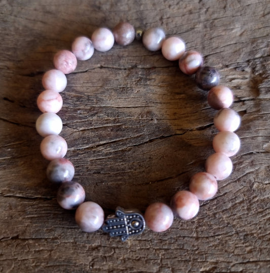 PINK ZEBRA JASPER ENERGY HAMSA HAND BRACELET 8 mm - COURAGE