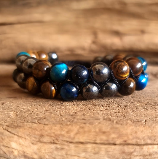 AGAINST EVIL EYE DOUBLE ROW BRACELET 8 mm - TIGER EYE, HEMATITE & OBSIDIAN