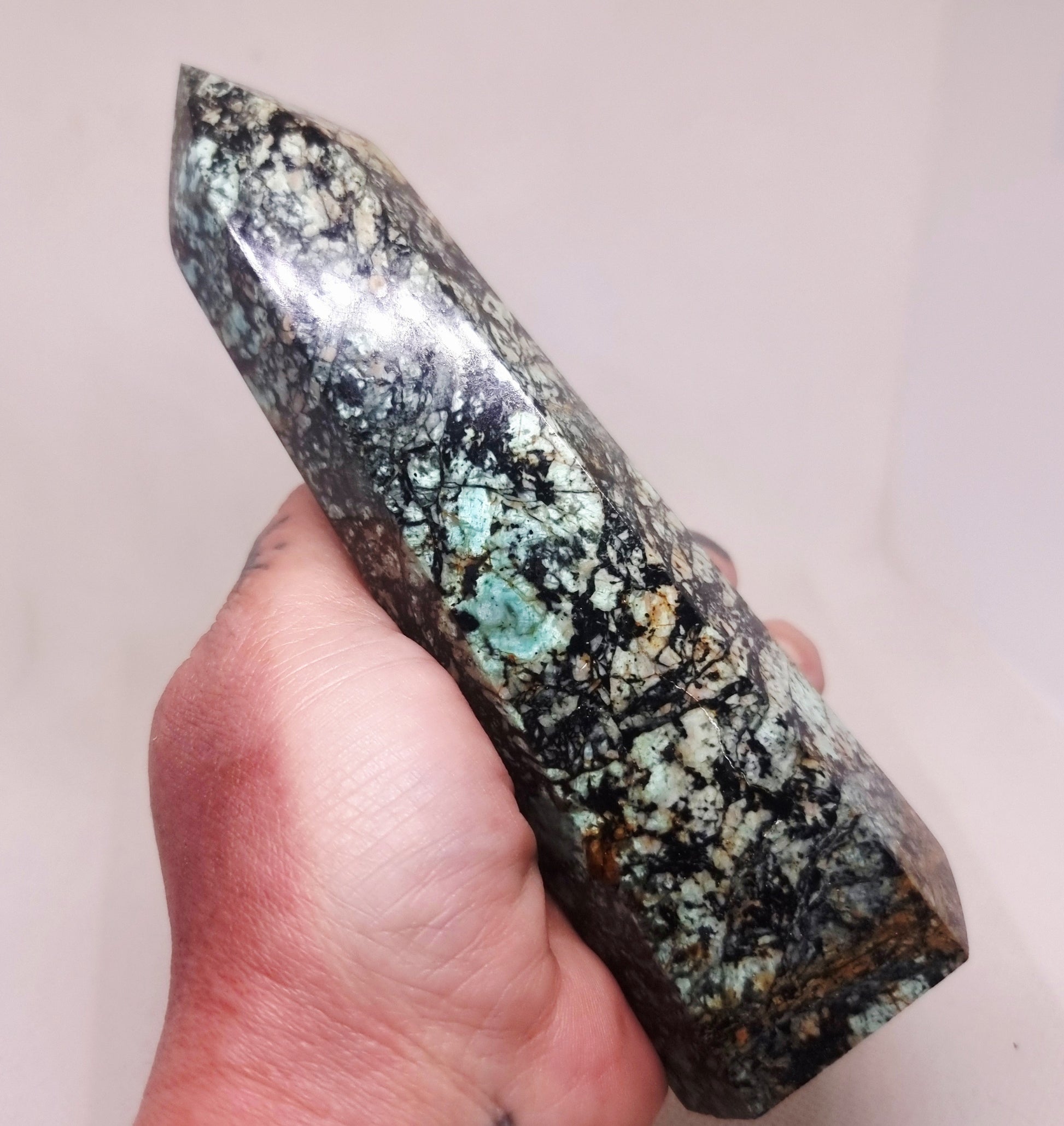 Chrysocolla towers direct energy upward, making them ideal for focused intention, emotional healing, and spiritual alignment 🌙