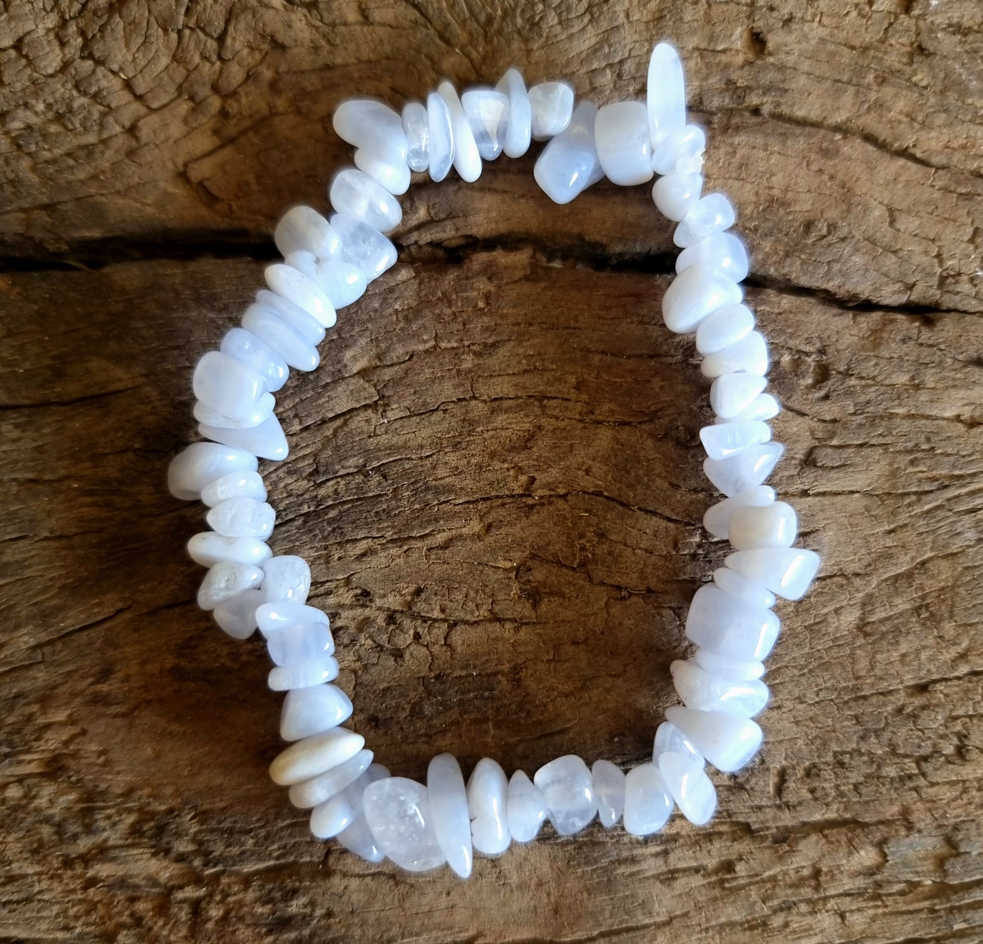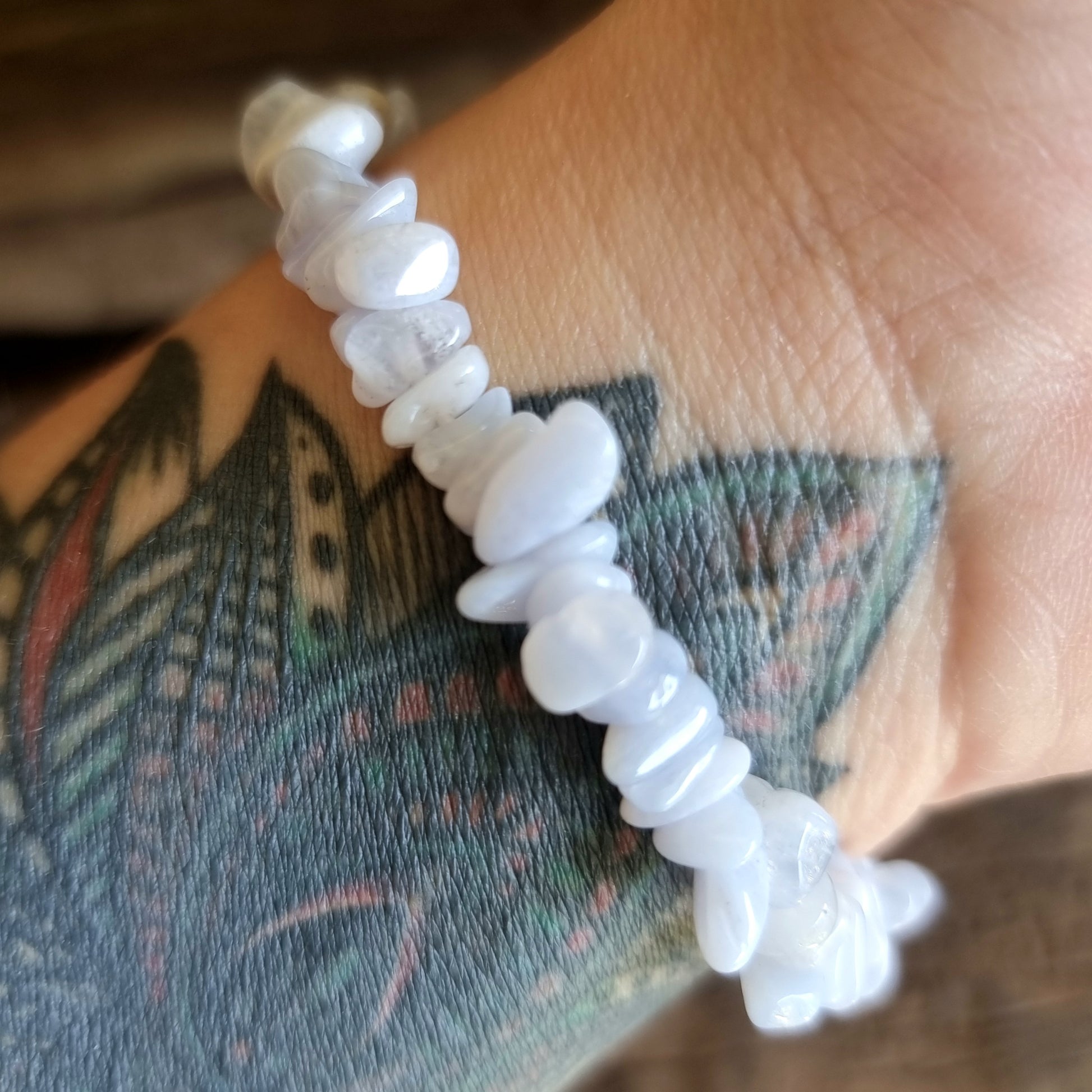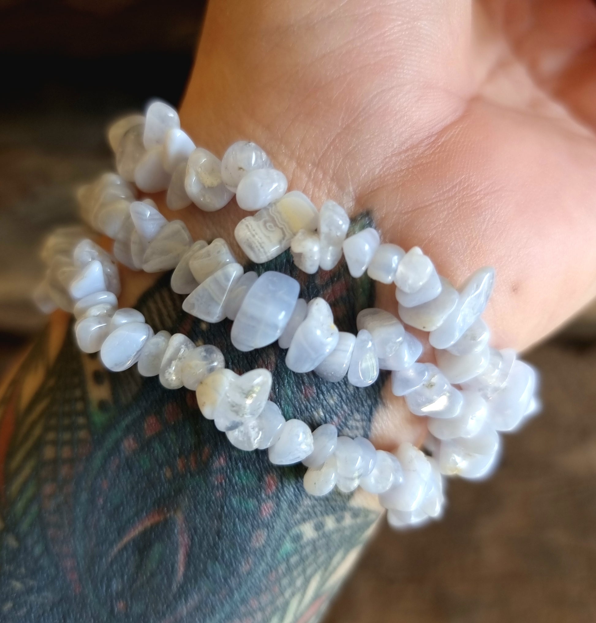 This BLUE LACE AGATE CHIPPED BRACELET is crafted with the healing emotional and energetic power of Blue Lace Agate. It will help bring on a sense of peace, balance, and hope, while empowering you to build relationships and embrace forgiveness. Enjoy the confident, optimistic energy of this bracelet.