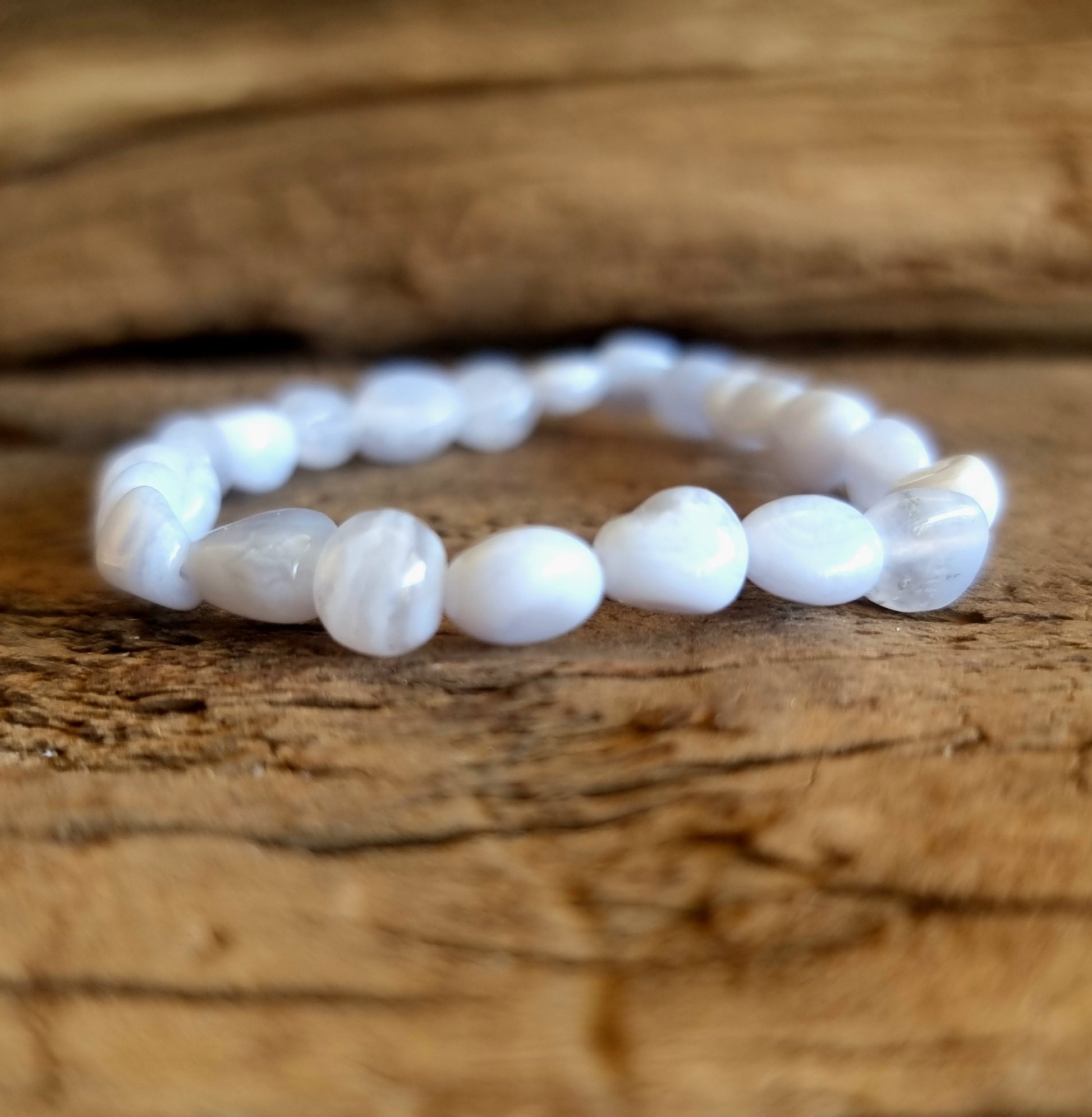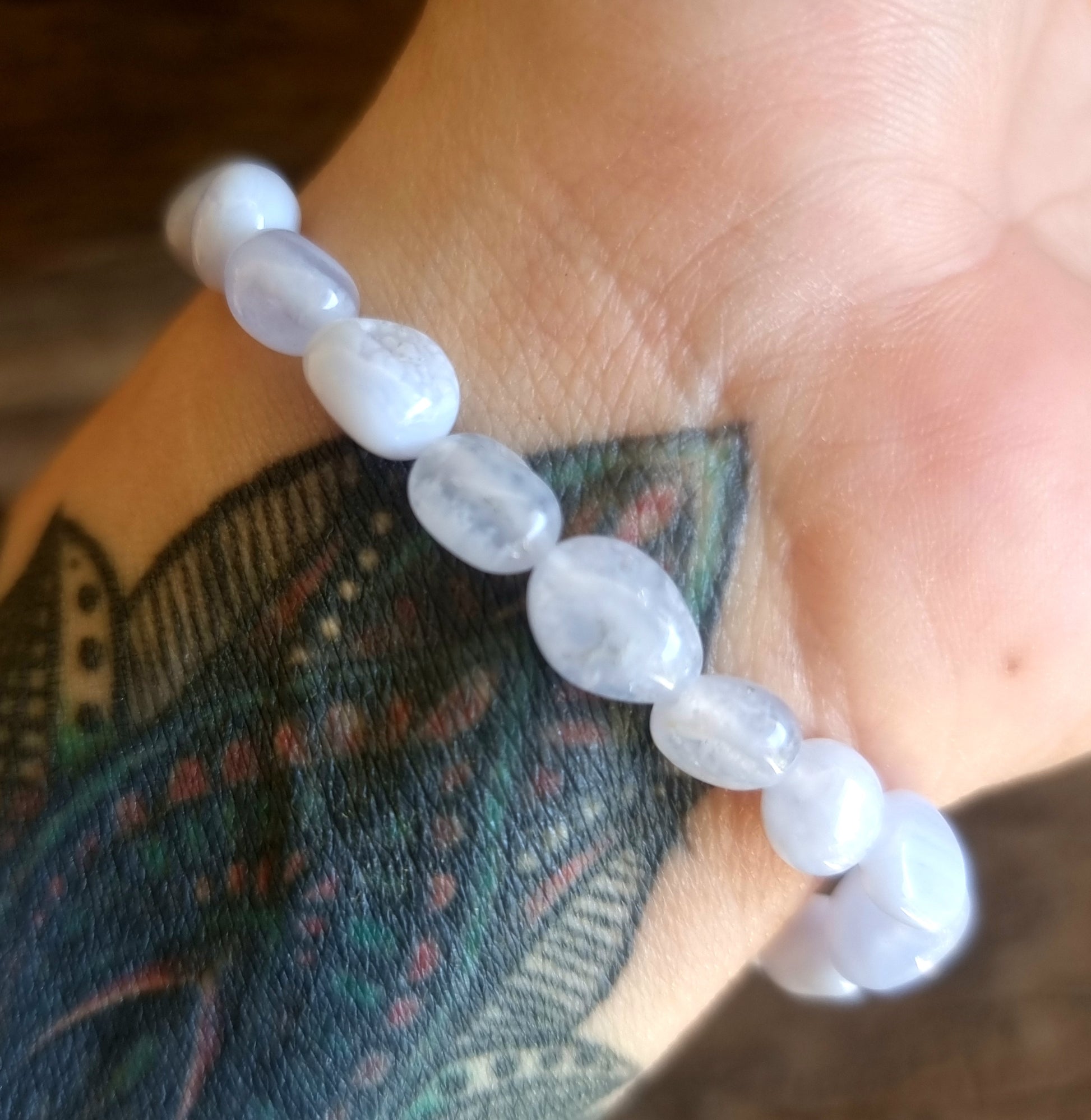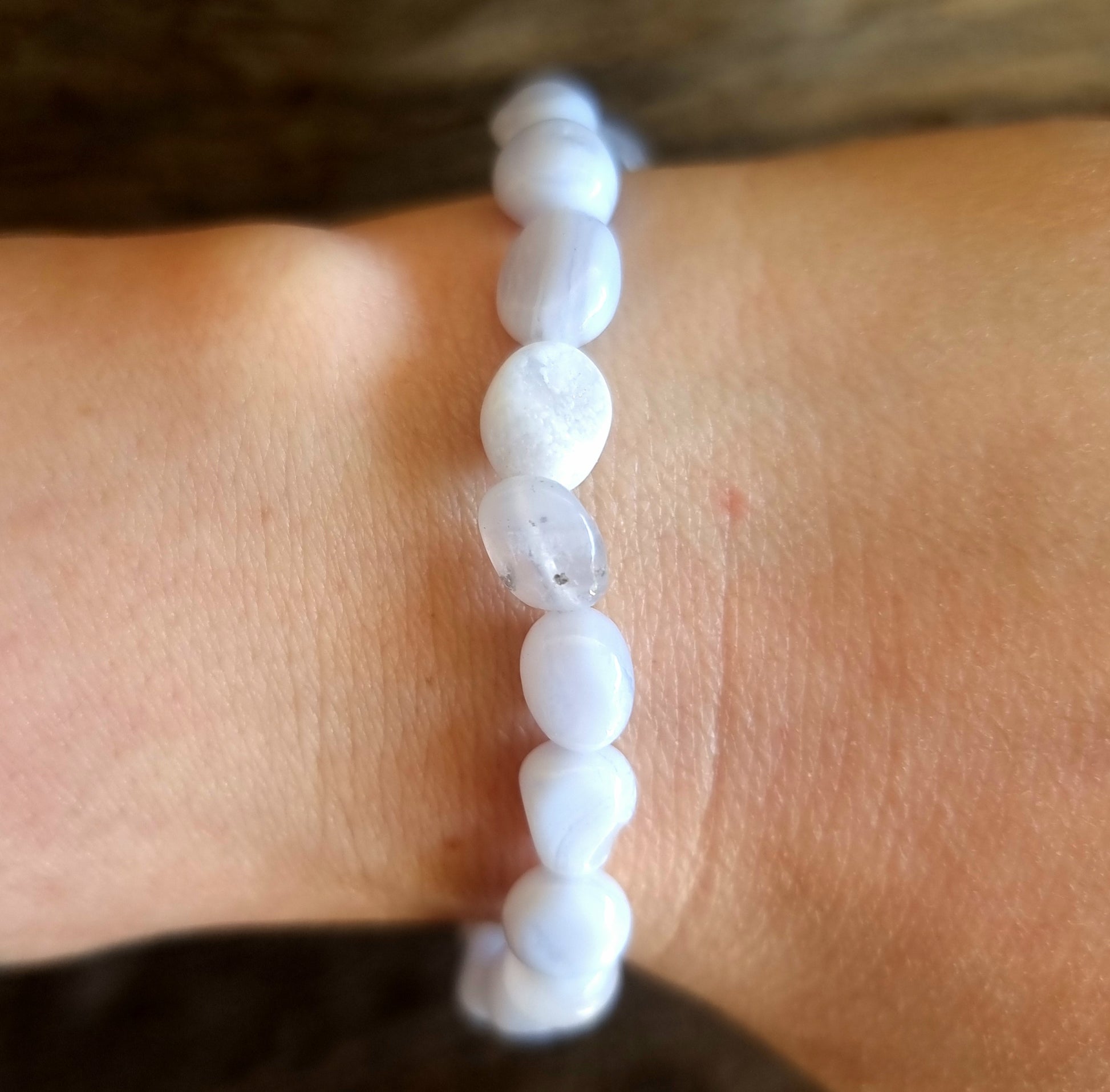 This BLUE LACE AGATE NUGGET BRACELET is crafted with the healing emotional and energetic power of Blue Lace Agate. It will help bring on a sense of peace, balance, and hope, while empowering you to build relationships and embrace forgiveness. Enjoy the confident, optimistic energy of this bracelet.