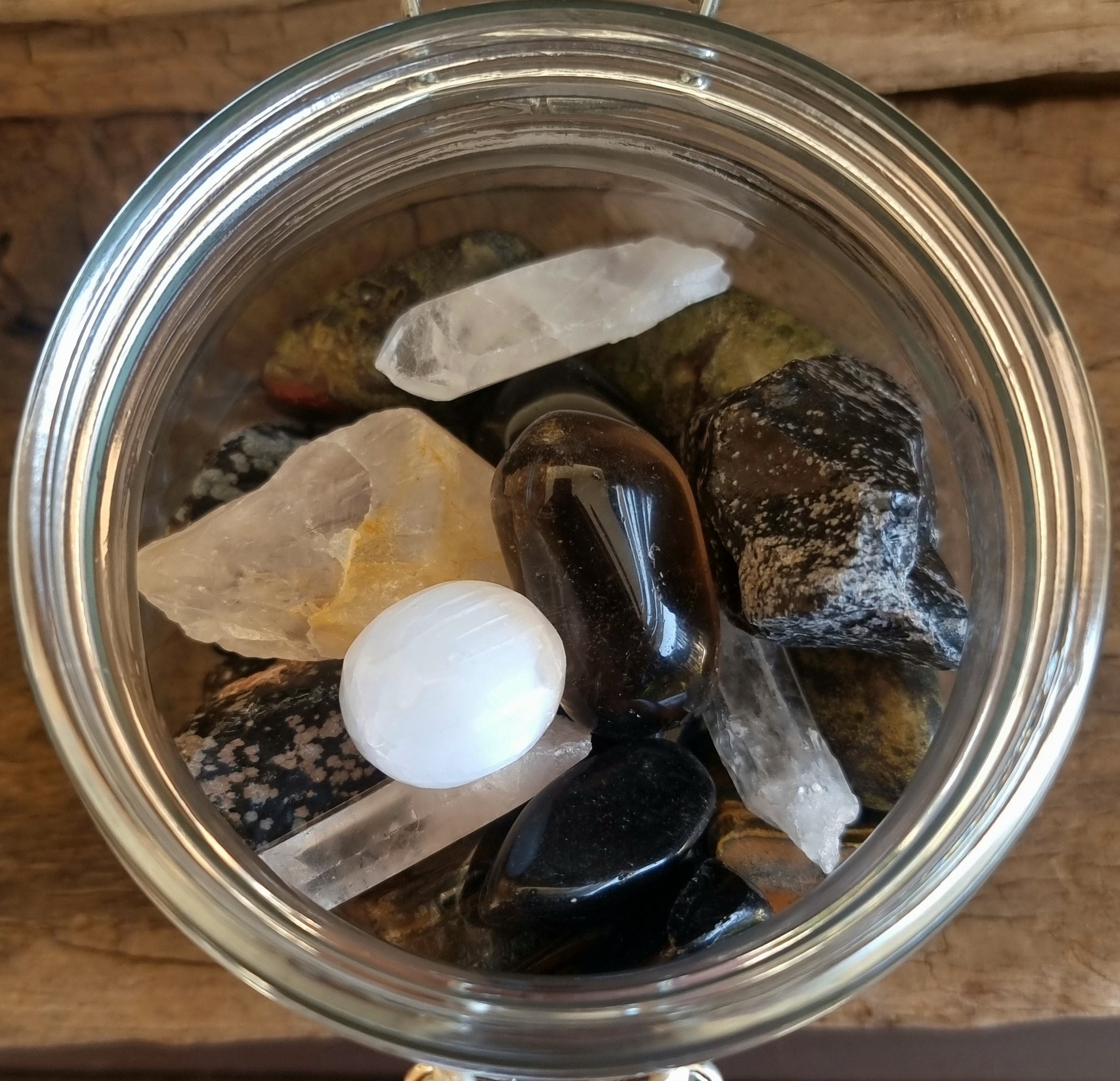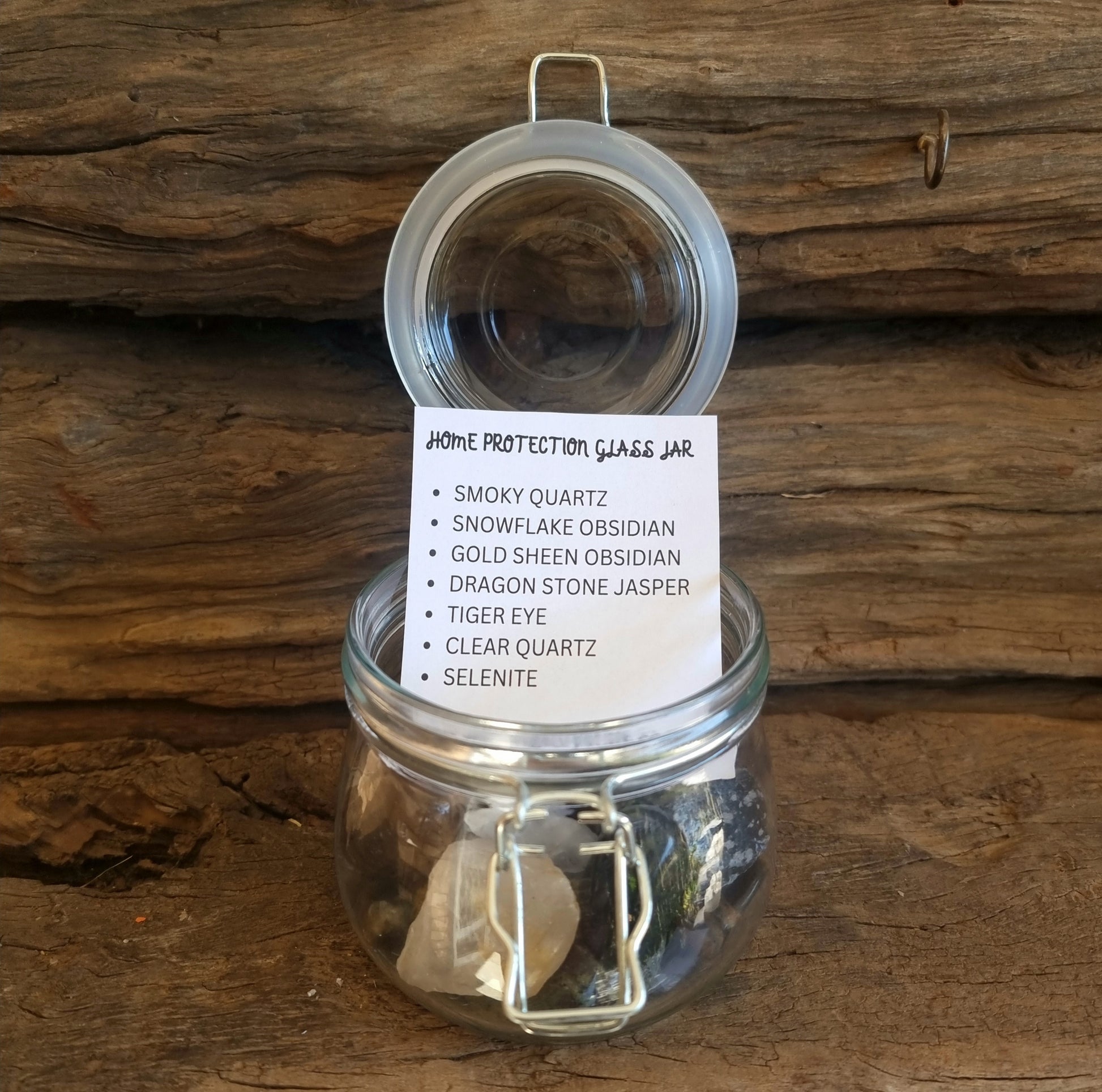 Crystals & gemstones have been used for centuries for healing. These stones have been specifically chosen for their strengths and healing properties. This is the perfect combination of home protection stones for your front or back door. Kept in a glass jar, ready to charge under full moon.