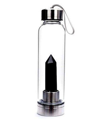 Stay energized and hydrated throughout the day with crystal infused water. At the center of this glass bottle is a stunning Black Onyx crystal. Black Onyx is a powerful protective stone that gives its wearer strength. It is absorbs and transforms negativity and helps with the development of emotional and physical strength. If you are in need and support during times of stress, confusion or grief this stone will protect, absorb and help in the healing and wise decision process